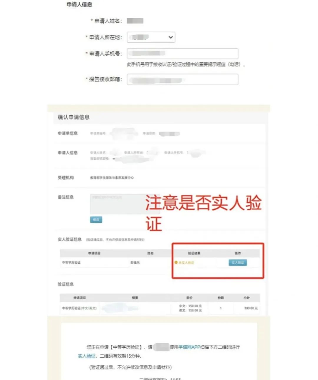 填写申请人的所在地、手机号、邮箱,点击保存后会出现 300元的付款页面,如果没有实人验证则需要本人下载学信网 APP扫码进行验证,验证完了之后支付300元就完成了~(参考价格,具体支付金额以官网为准)