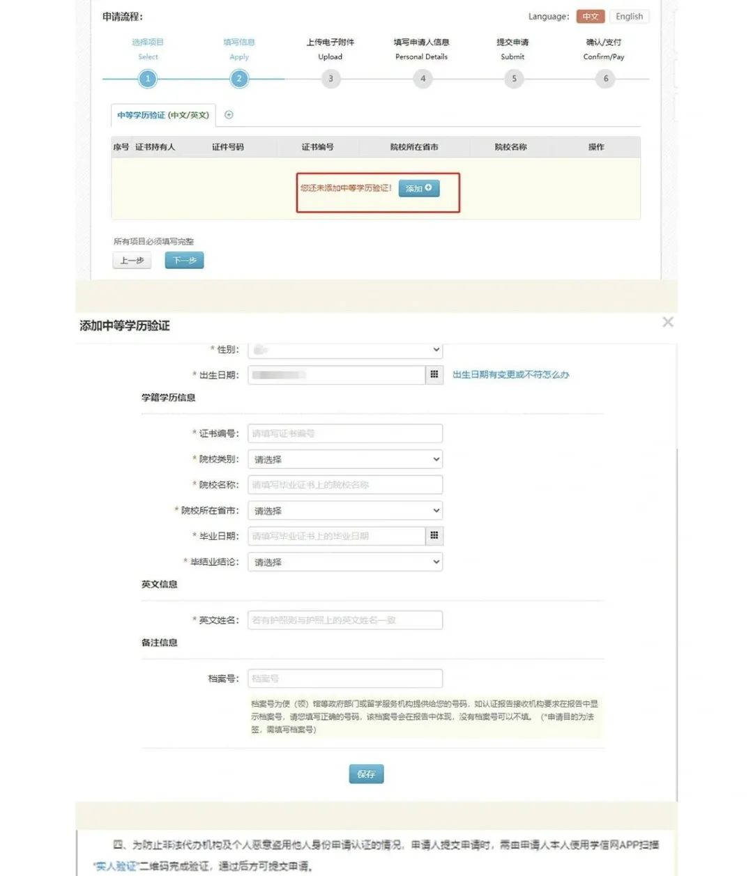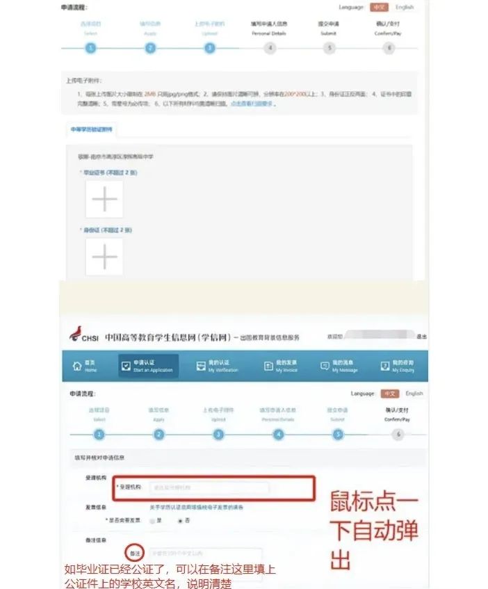 如果毕业证已公证,可以在在这里的备注栏备注公证件上的学校英文名。