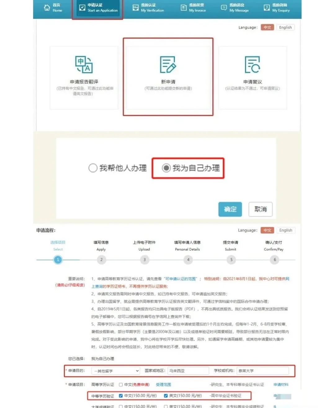 点击申请认证-新申请-我为自己办理,进入申请流程,申请目的选择自己要去留学的国((没有就选择其他留学) ,其他留学的国家和地区手动填写你要去的国家,学校或者机构手填写你要去的学校,申请高中毕业证书验证就选择对应的学历验证。