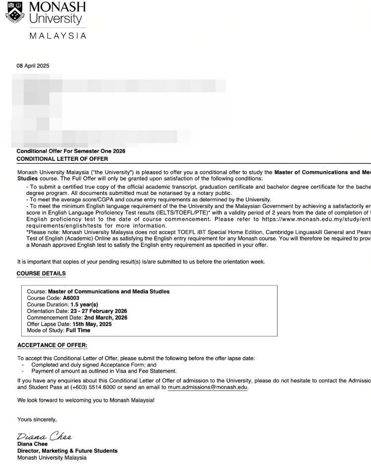 马来西亚莫纳什大学录取信类型与区别