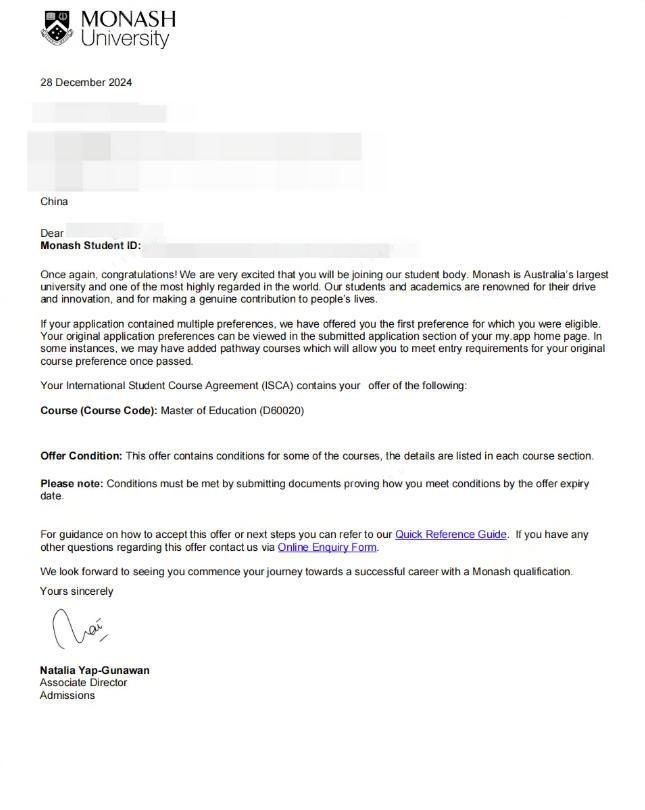 马来西亚莫纳什大学录取信类型与区别